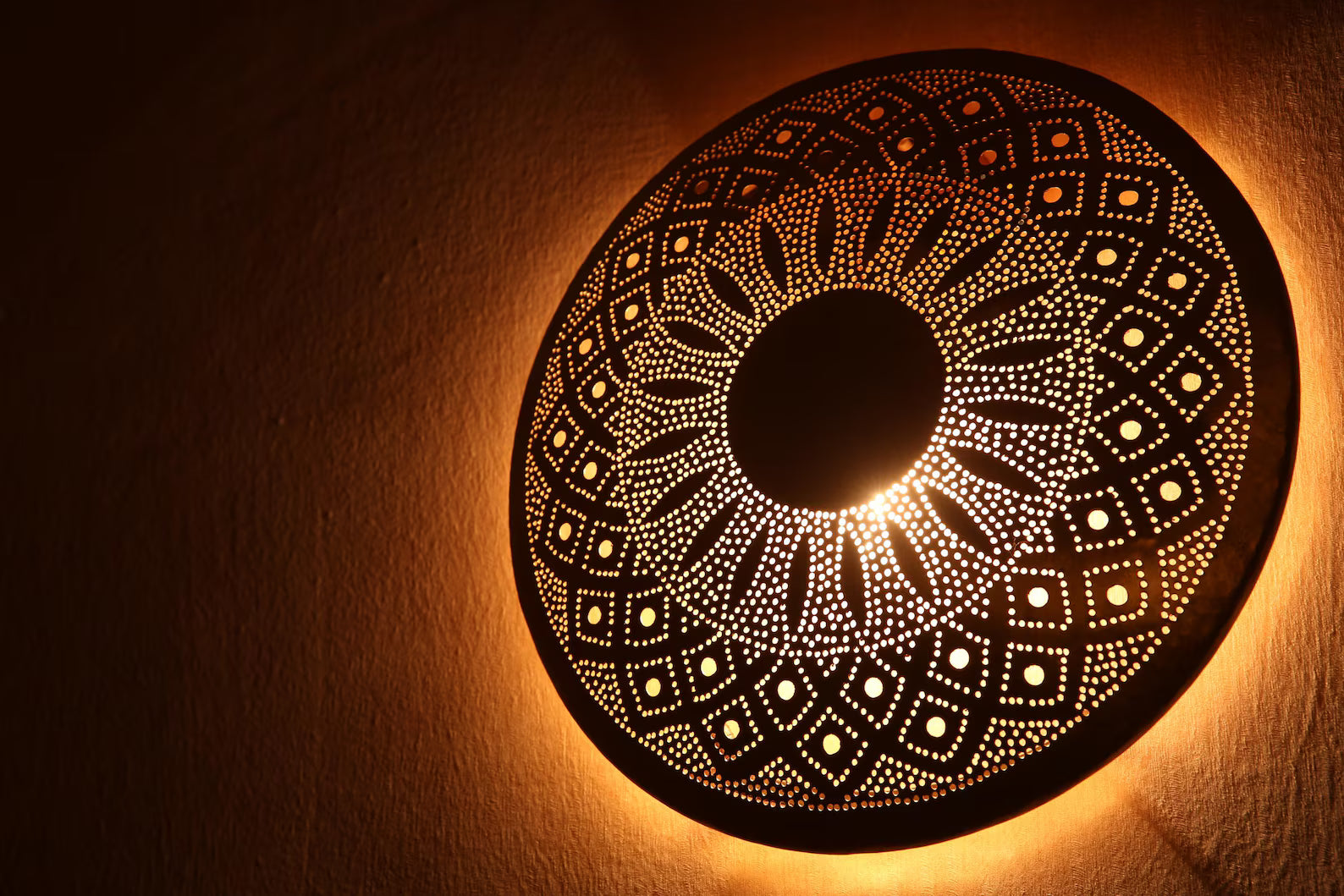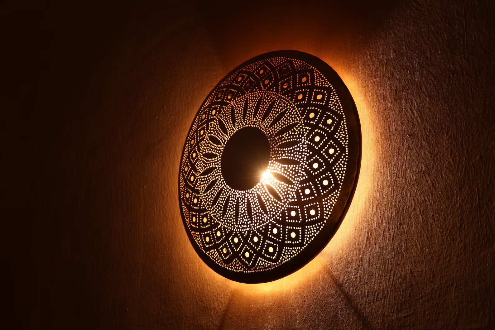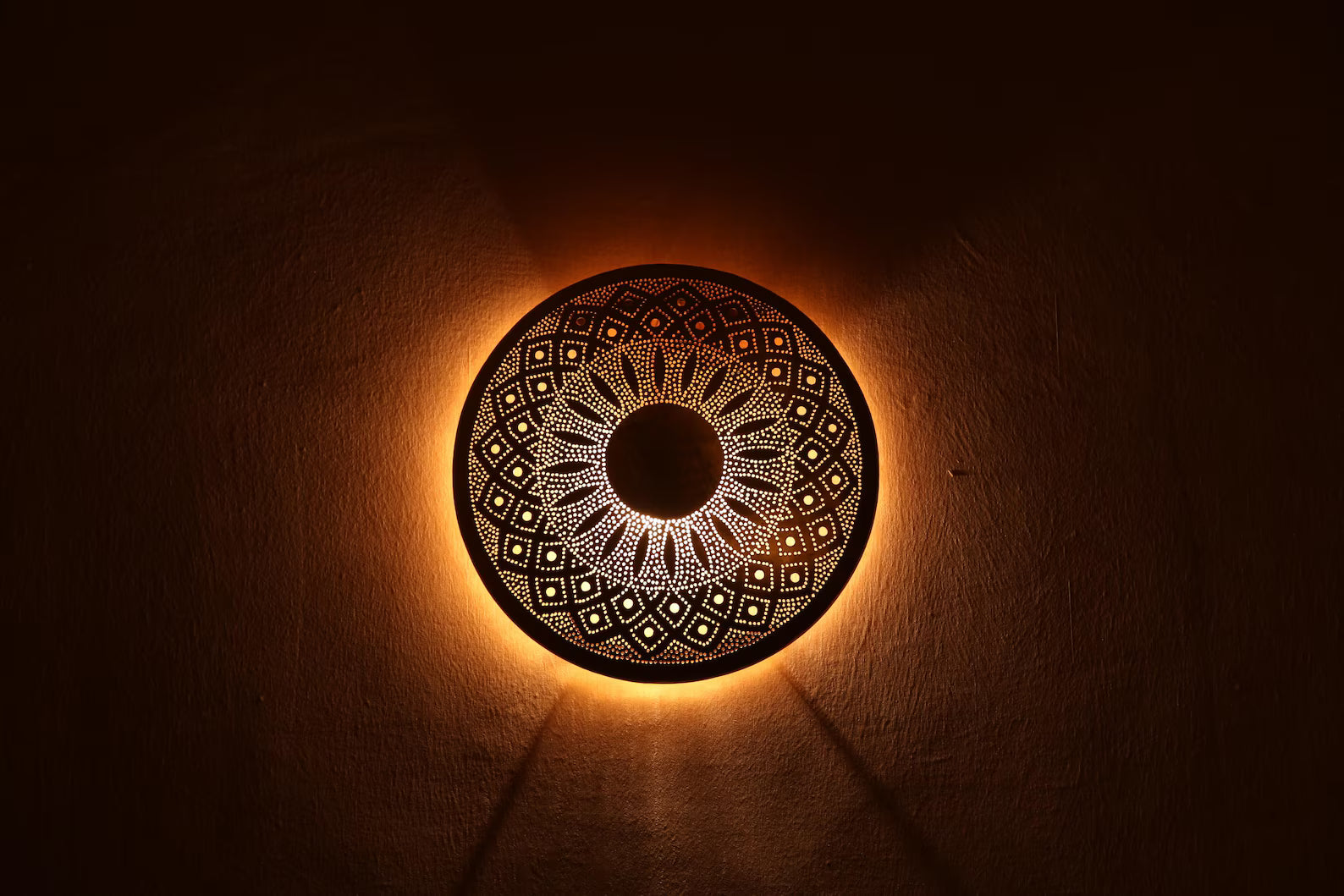 Moroccan Brass Wall Sconce – Handmade Round Light Fixture, Geometric Design, Ambient Glow, Boho Decor, Riad Lighting, Artisan Made